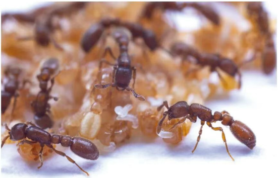 成年工蚁把幼虫(白色)放置在蛹(浅棕色)旁边,以便幼虫吃到蛹分泌出来的营养液|参考资料[3]